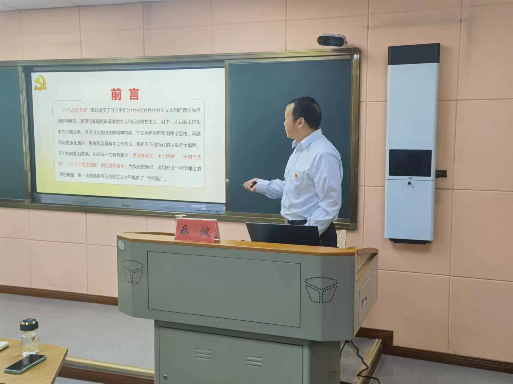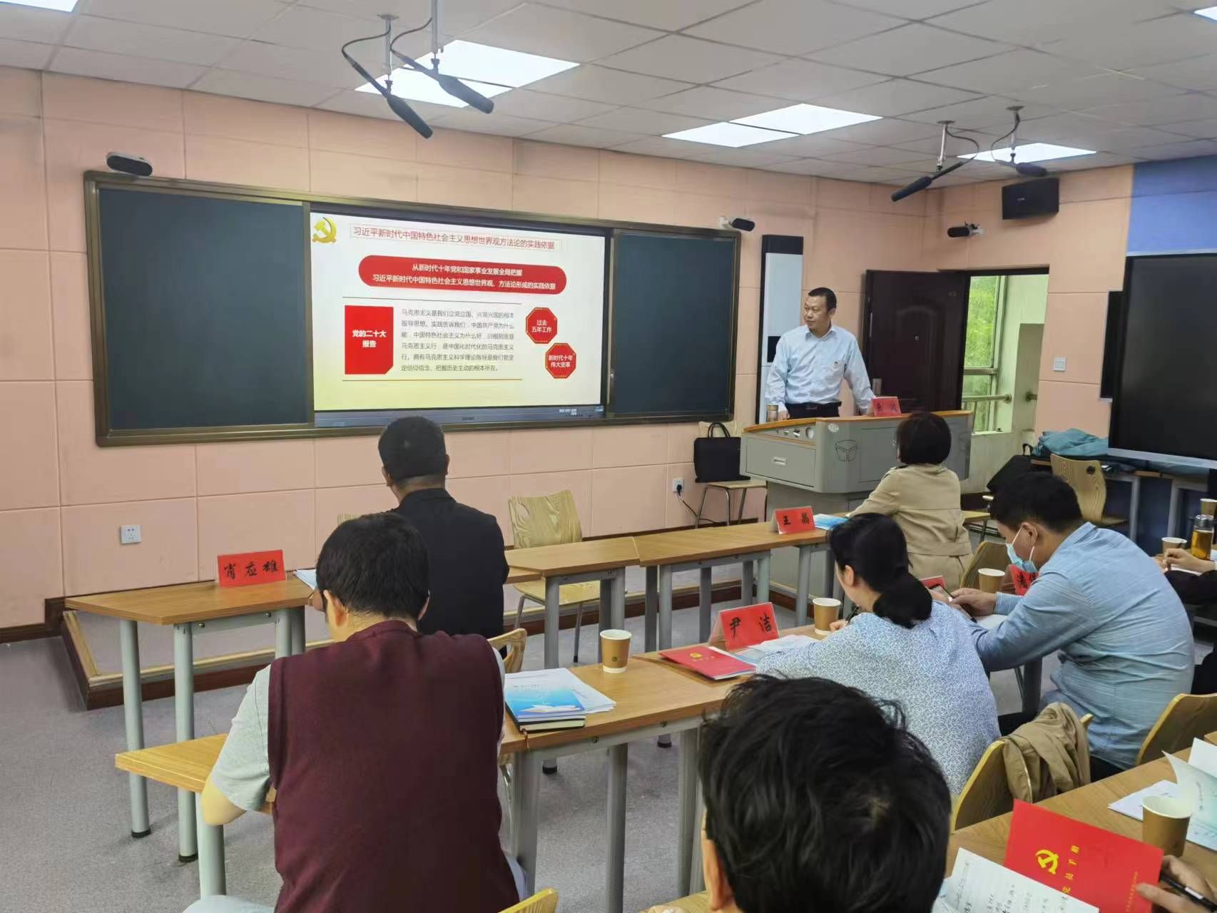 随后,专家辅导报告。学院特邀马克思主义学院院长乐波教授为大家作了题为《习近平新时代中国特色社会主义思想的世界观和方法论》专题报告。乐教授从习近平新时代中国特色社会主义思想世界观和方法论的实践依据;科学内涵;丰富发展三大块作了一场生动而振奋人心的报告。