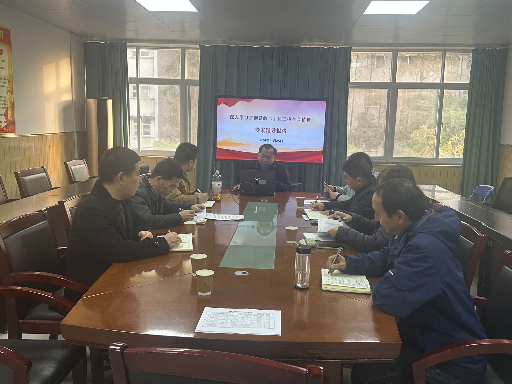 第一阶段专家辅导报告。学院邀请马克思主义学院李新安教授做专题讲座。党委副书记尹洁主持会议。李教授的《全面把握党的二十届三中全会的历史地位》辅导报告,从党的二十届三中全会的历史意义、理论意义、现实意义、方法论意义、世界意义五个方面,生动而深刻地阐述了党的二十届三中全会和全会通过的《决定》对进一步全面深化改革推进中国式现代化,对以中国式现代化推进强国建设和民族复兴的重大意义。