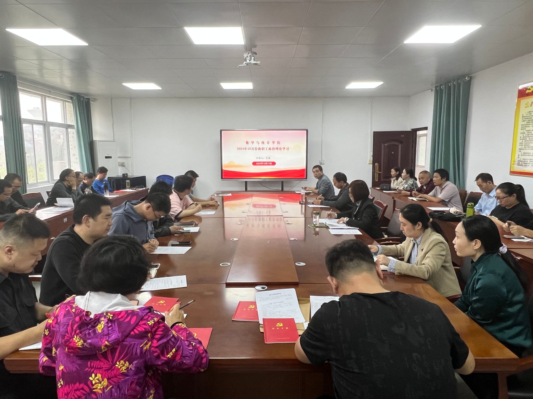 10月17日下午,数统学院在学院三楼310会议室召开了2024年10月份全体教职工政治学习会议,会议由学院党委书记王晶主持,全体教职员工参加学习。