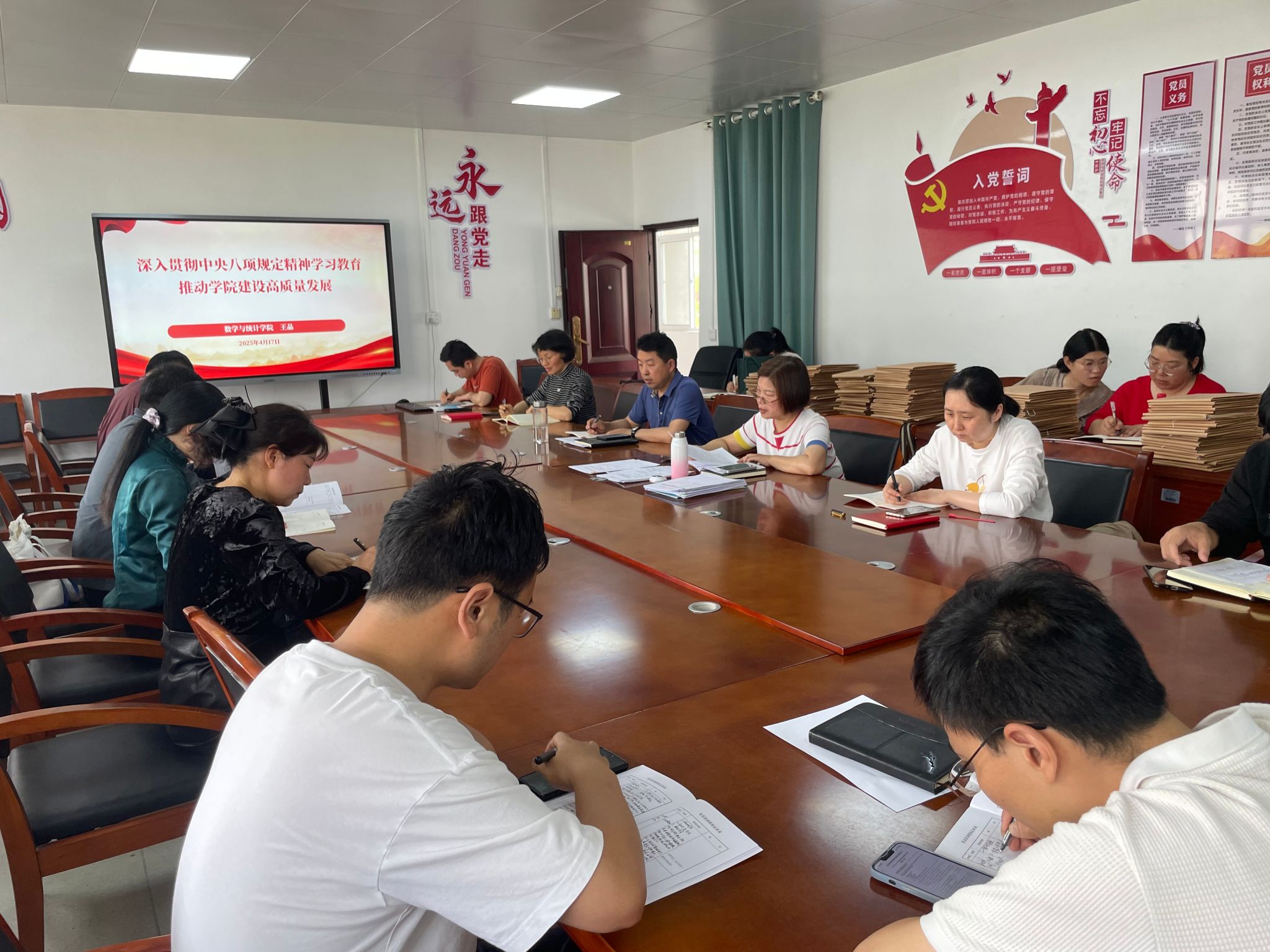王晶以“深入贯彻中央八项规定精神学习教育,推动学院建设高质量发展”为题讲课。她指出,全体党员干部要提高政治站位,增强政治自觉,深刻认识开展深入贯彻中央八项规定精神学习教育的重要意义。当前学院正在加快推进本科教育教学改革发展,本科专业监测评估,着力在数学与应用数学专业精品化,经济统计学专业、数据科学与大数据技术专业数字化、智能化上抢占赛道,推动学院专业内涵建设,形成发展新态势。