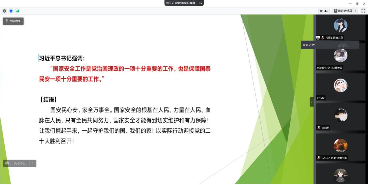 为遵守学校疫情防控规定,此次主题班会主要采取线上举行的模式,虽然是线上举行,同学们仍然保持了较高的热情,积极参与,广泛讨论。