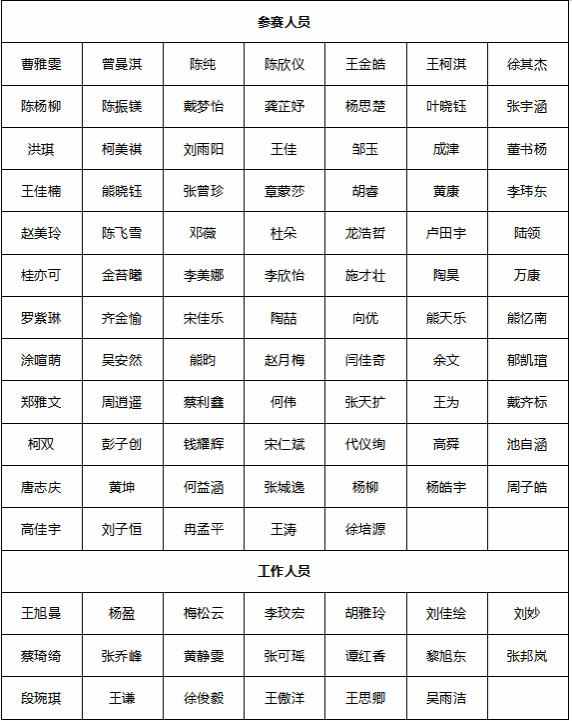 为弘扬集体精神,表彰在合唱比赛中表现突出的参与者与工作人员,经研究决定,对以下个人予以通报表扬。希望受表彰的同学珍惜荣誉,再接再厉,在今后的活动中继续发挥榜样作用,为学院文化建设贡献力量。