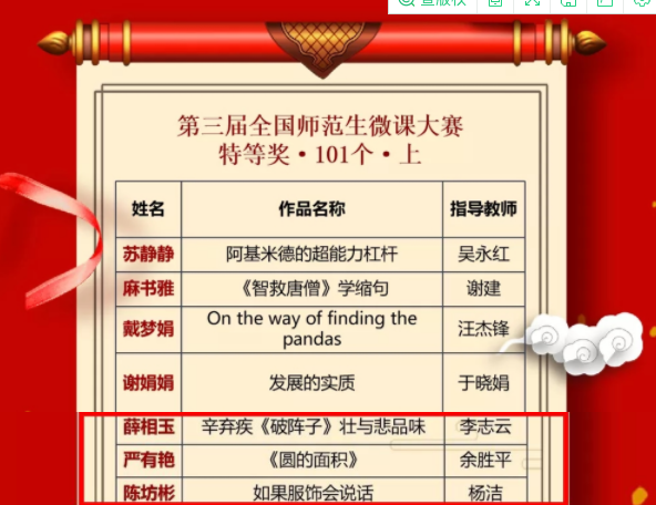日前,从全国师范生微课大赛官方平台传来喜讯,beat365选送的两件微课作品在第三届全国师范生微课大赛中全部获奖,其中0213011121班严有艳同学的作品《圆的面积》获特等奖(指导教师:余胜平)、0193011141班毛婉平同学作品《轴对称图形》获二等奖(指导教师:史杰),余胜平老师同时获评“优秀指导教师”。