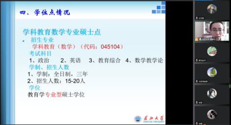 会议伊始,主讲人袁海山依次介绍了长江大学信息与数学学院、学科及研究方向、硕士生导师、学位点情况、奖助学金体系和就业。对招生政策、报考指南、专业建设等方面的信息进行详细解释,也对考研的选择进行分析,给出三个慎重:热门学校要慎重、热门专业要慎重,热门区域要慎重,给予同学们切合实际的建议。