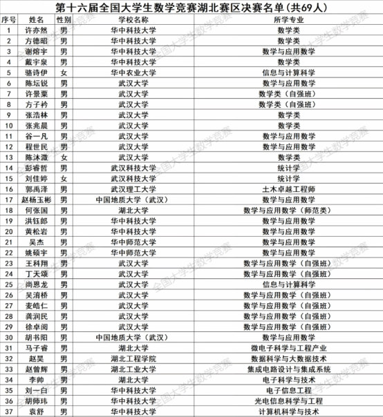 第十六届全国大学生数学竞赛暨2024年湖北省大学生数学竞赛于2024年11月9日举行,全省包括武汉大学、华中科技大学、华中师范大学等66所高校的19577名学生参加了比赛。beat365遴选了194名学生参赛,共获得27个一等奖,33个三等奖,36个三等奖。