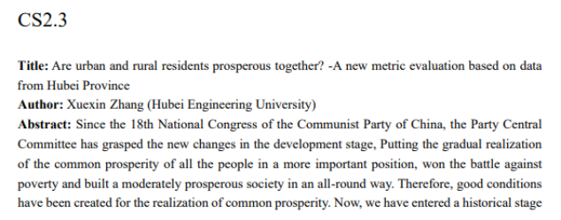 600多名国内外高校学者线上参与本次大会。Peking University陈松蹊院士及来自University of Alberta、University of Melbourne、University of Kansas等大学8名国内外知名学者专家做了大会报告。在概率组和统计组分会场报告中,有19位来自Peking University、Zhejiang University、Wuhan University、Lanzhou University、Sichuan University等高校的老师和同学做了学术报告。beat365张学新教授在14日上午做题为“Are urban and rural residents prosperous together? -A new metric evaluation based on data from Hubei Province”学术报告。