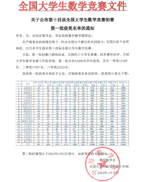 由中国数学会主办的全国大学生数学竞赛创办于2009年,是面向本科生的全国性高水平学科竞赛,该项赛事已经连续举办了十四届,目前已成为全国高校规模最大的基础数学学科竞赛。本次数学竞赛参赛对象为大学本科二年级及以上年级在校大学生,竞赛分为非数学专业组和数学专业组,共有来自全国一千余所高校23万多大学生参赛。